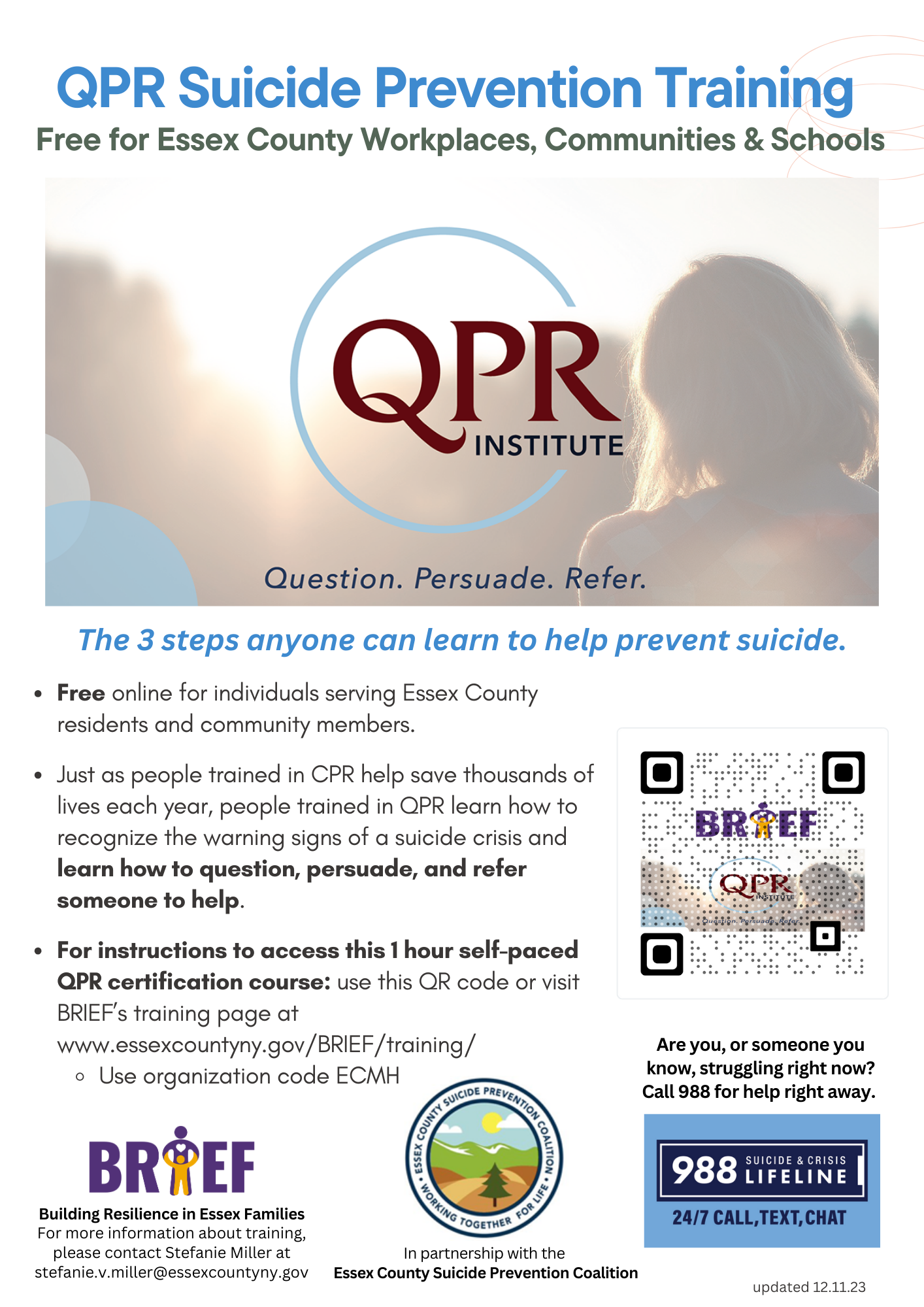Mission: The Mission of the Essex County Suicide Prevention Coalition is to work together as a community to increase suicide awareness and prevention.