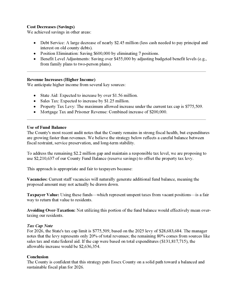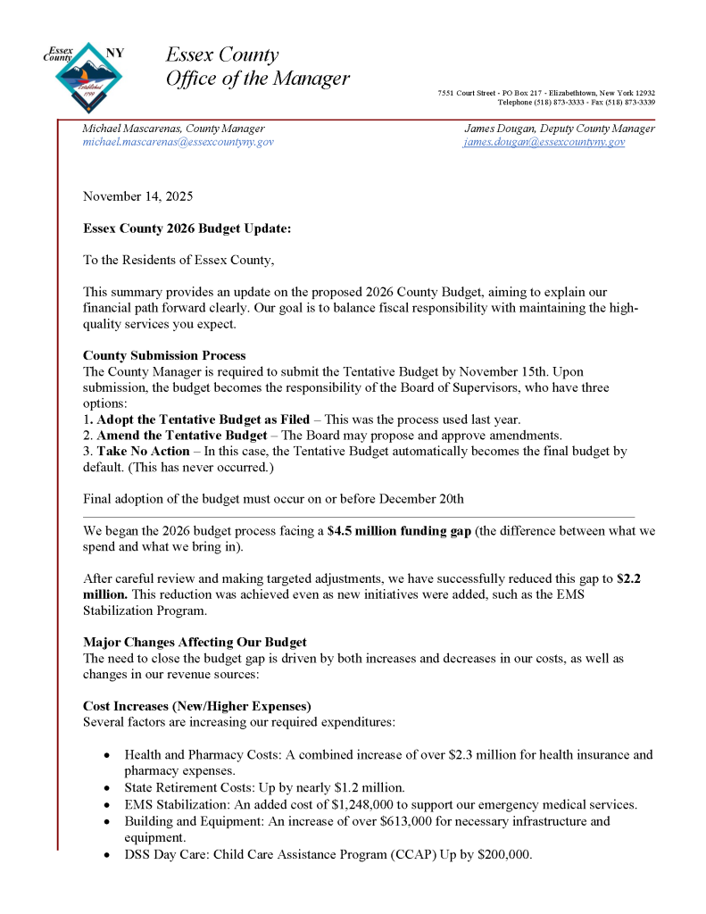 17 Nov 2025 Press Release – County Manager Provides 2026 Tentative Budget Update to County Residents by Essex County | posted in: Board of Supervisors, Treasurer's Office | 0 Tentative Budget 2026 (PDF) Informational Packet (PDF) Budget Update from County Manager to Residents (PDF) Public Hearing on 2026 Tentative Budget set for November 24th, 2025 (PDF) This page was last updated on Monday, November 17th, 2025.