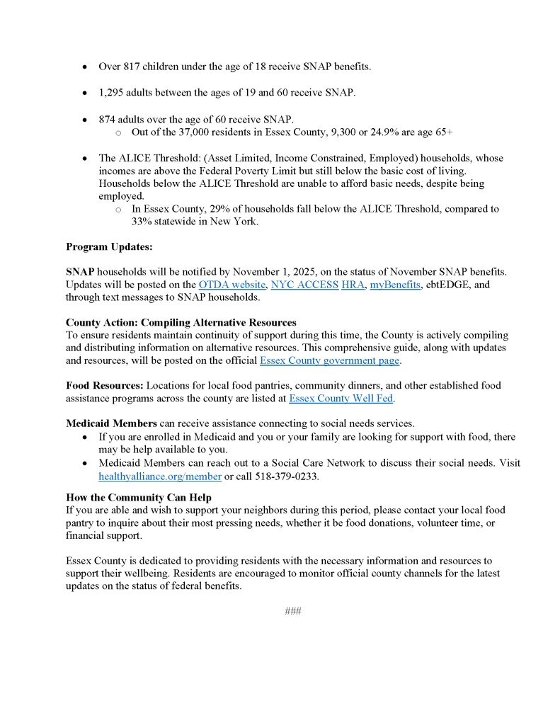 30 Oct 2025 Press Release – Essex County NY Advises Residents of Potential SNAP Funding Delay by Essex County | posted in: Health Department, Social Services | 0 NOTICE: This post is now archived and information on this page may no longer be relevant or up to date. Snap Funding Delay Press Release Download (PDF) Interactive Map of Food Program Locations (Well Fed EC Collaborative Website) This page was last updated on Thursday, October 30th, 2025.