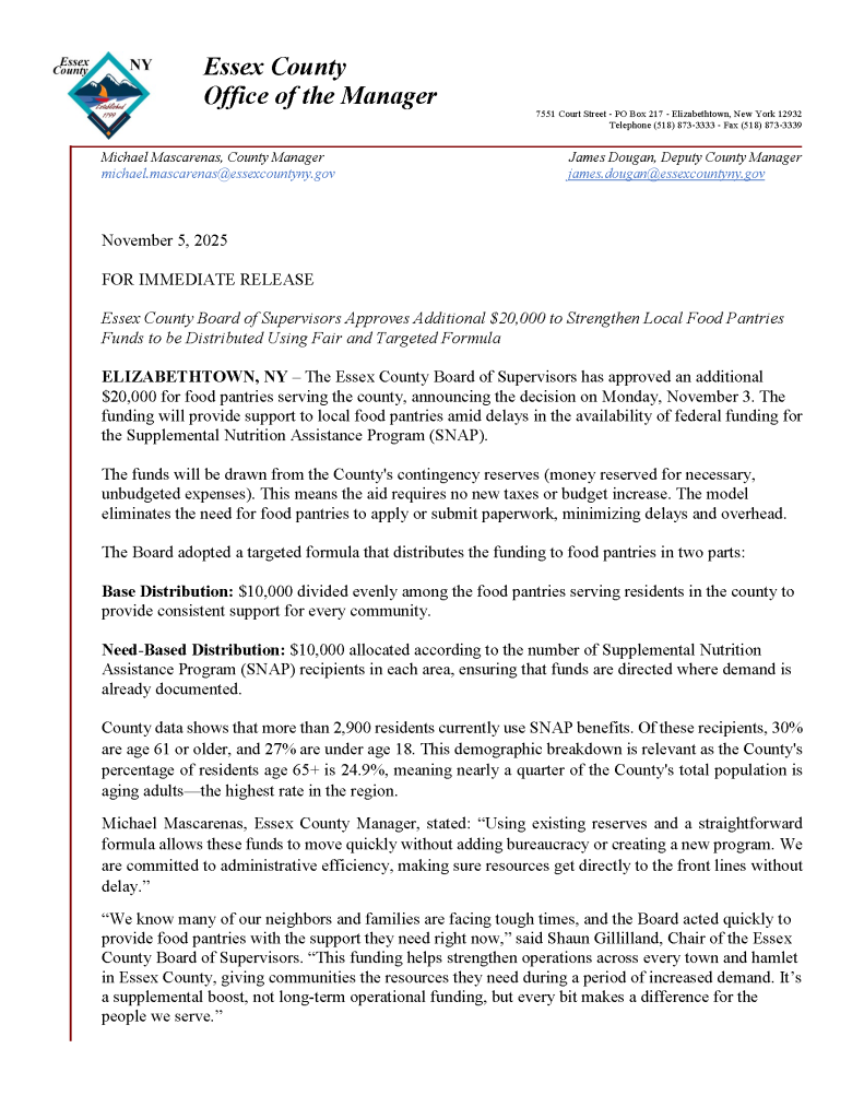 5 Nov 2025 Press Release – Essex County Board Approves Additional Funding for Food Pantries by Essex County | posted in: Board of Supervisors, Health Department, Social Services | 0 Additional Funding for Food Pantries Press Release Download (PDF) Interactive Map of Essex County Food Programs (Well Fed EC Collaborative Website) This page was last updated on Wednesday, November 5th, 2025.
